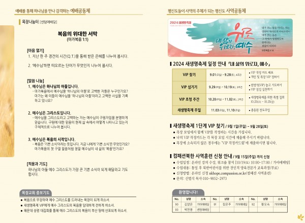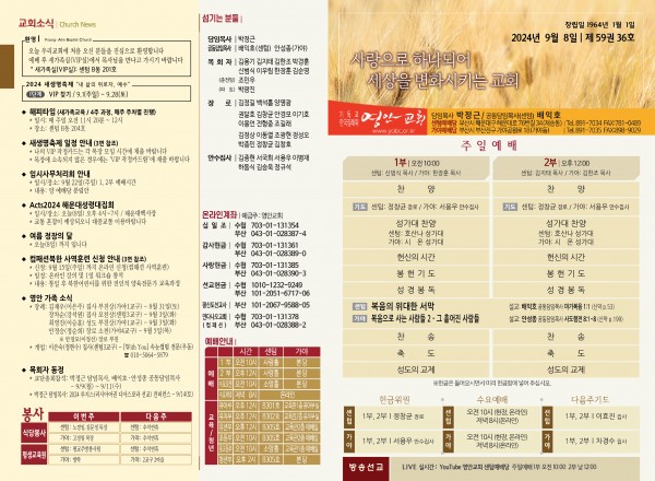 2024년 9월 8일 주보 (센텀예배당) 페이지 정보 작성자 관리지기 작성일24-09-07 11:12 조회1,783회 댓글0건 관련링크 목록 본문 2024년 9월 8일 주보 (센텀예배당) 댓글목록 등록된 댓글이 없습니다. 목록