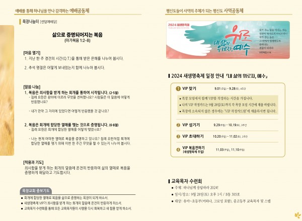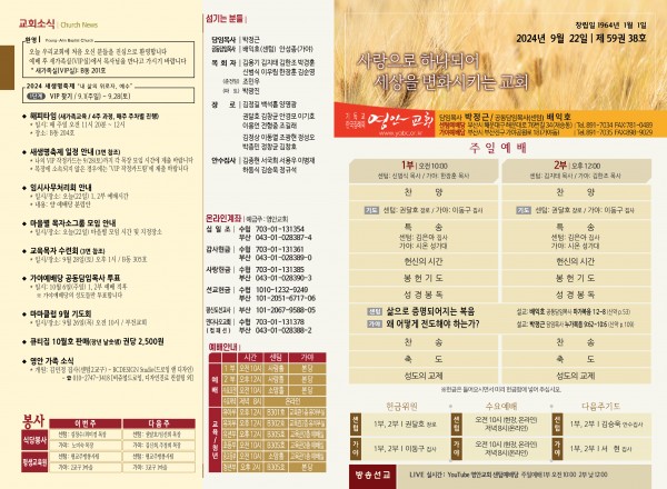 2024년 9월 22일 주보 (센텀예배당) 페이지 정보 작성자 관리지기 작성일24-09-21 10:50 조회2,025회 댓글0건 관련링크 목록 본문 2024년 9월 22일 주보 (센텀예배당) 댓글목록 등록된 댓글이 없습니다. 목록